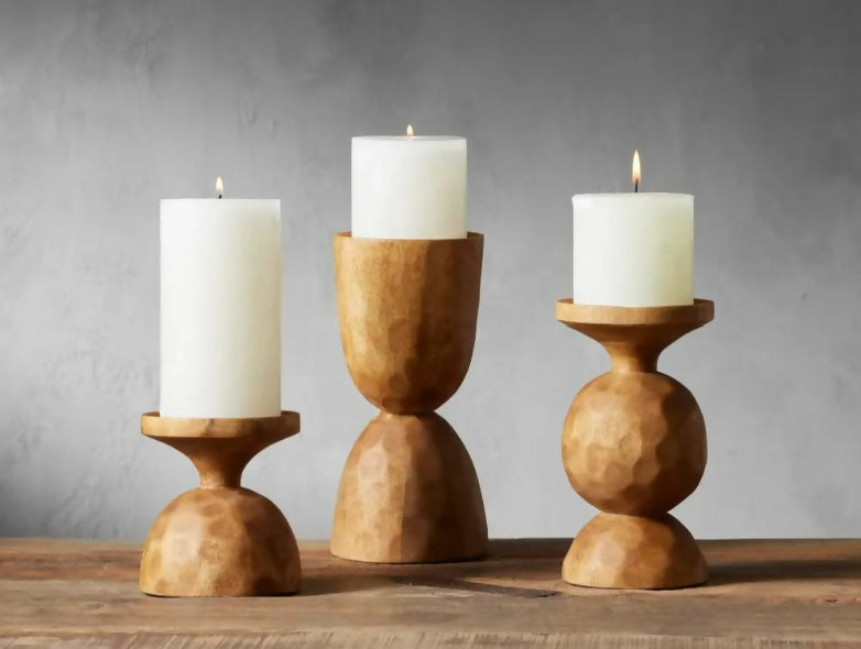 The voluminous shapes of our Idra Pillar Candle Holders are inspired by the beauty of ancient African carvings. Crafted from solid, natural mango wood with hand-carved details, each piece carries the same silhouette, yet showcases unique character. These rustic décor accents work together beautifully and make a statement when displayed on their own as well.